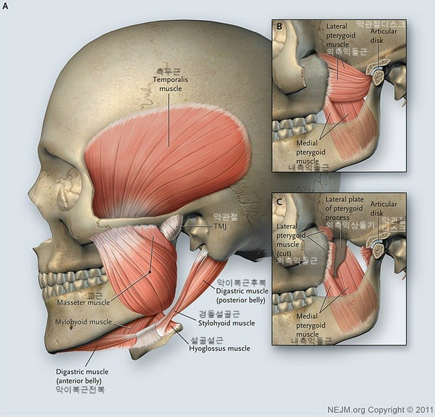 근막 상태: 저작근·측두근·익돌근과 후두하근 등이 붙어있거나 긴장된 상태