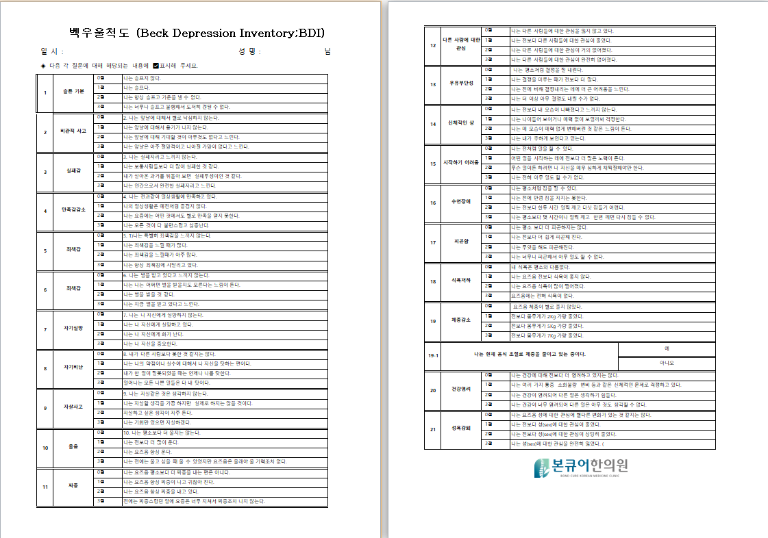 불안척도(BAI)는 37점에서 23점으로, 우울척도(BDI)는 23점에서 7점으로 떨어졌습니다.